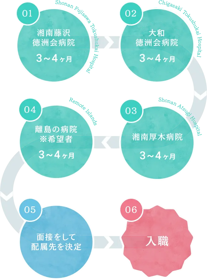 特長の異なる3病院をローテーションで勤務しながら、自分に合った職場を見つけることができる、湘南アライアンス独自のプログラムです。
